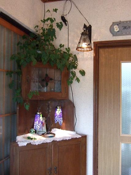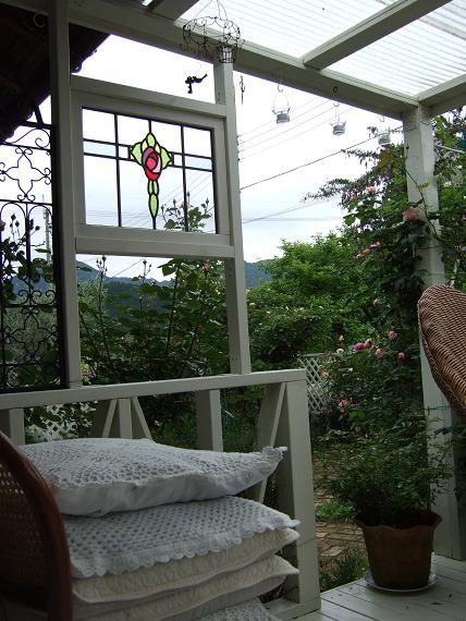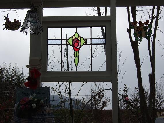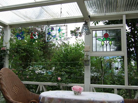 ウッドデッキに取り付けたステンドグラス